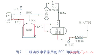 正常情況下,儲(chǔ)罐的日蒸發(fā)量(質(zhì)量比)大約在0.03%~0.08%左右,對(duì)于大型儲(chǔ)罐來(lái)說(shuō),這已相當(dāng)可觀,對(duì)其進(jìn)行回收可以帶來(lái)巨大的經(jīng)濟(jì)和社會(huì)效益。目前,BOG回收包括二方面內(nèi)容,一是對(duì)LNG氣化產(chǎn)生的天然氣進(jìn)行回收,二是對(duì)BOG攜帶的冷量進(jìn)行回收。