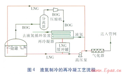 再冷凝過(guò)程中,采用外部制冷介質(zhì)(如液氮)提供冷量使BOG液化為LNG的工藝流程見(jiàn)圖4,液氮和丙烷是兩種比較常見(jiàn)的制冷劑[13-14]。