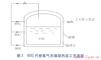 BOG氣體需要及時(shí)排出以維持儲(chǔ)罐的微正壓,一個(gè)辦法是使用BOG代替氮?dú)獬涮罡魺釋?。利?/span>BOG充填絕熱層只需在原儲(chǔ)罐基礎(chǔ)上稍加改造就可實(shí)現(xiàn),投資很少,可以省去制氮設(shè)備,經(jīng)濟(jì)高效,且熱量流入時(shí)首先會(huì)被低溫的BOG氣體吸收,儲(chǔ)罐的隔熱效果更好。俞樹榮、席家福[10]在這方面進(jìn)行了探索和論證,并對(duì)BOG充填隔熱層進(jìn)行了傳熱分析,給出了具體的計(jì)算,提出了BOG代替氮?dú)獬涮罡魺釋拥墓に嚵鞒?/span>(見(jiàn)圖3)。但是,充填隔熱層用量對(duì)于大型儲(chǔ)罐的日產(chǎn)BOG量來(lái)說(shuō)比較小,并不能從真正意義上減少BOG的排放。