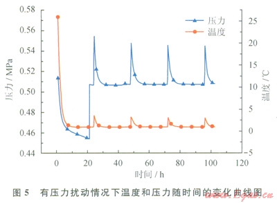 在系統(tǒng)降溫的過程中,隨著環(huán)境溫度的降低,反應(yīng)釜內(nèi)溫度逐漸降低,直至降低至恒溫空氣浴設(shè)定的溫度下限值,體系溫度保持恒定為止,同時(shí),體系壓力也逐漸下降。在無壓力擾動(dòng)的情況下,向反應(yīng)釜內(nèi)充入C3H8氣體,使體系溫度達(dá)到0.51MPa,在降溫的過程中,隨著外界環(huán)境和反應(yīng)體系溫度的降低,體系壓力逐漸降低。氣體水合物的生成過程包括氣體溶解、誘導(dǎo)成核和水合物生長3個(gè)階段。在圖4中,由溫度和壓力曲線的變化可知,在實(shí)驗(yàn)過程的前20h,屬于水合物生成過程的氣體溶解和誘導(dǎo)成核階段,溫度隨時(shí)間的變化曲線基本上呈直線,而由于氣體的溶解,壓力隨時(shí)間變化的曲線呈下降趨勢。隨著時(shí)間的推移,溫度隨時(shí)間的變化曲線分別在24h、45h、70h、93h處出現(xiàn)突變峰。由于氣體水合物的生成過程是一個(gè)放熱反應(yīng)。因此,溫度突變峰的出現(xiàn)意味著有水合物生成,這些點(diǎn)為水合物的快速生成點(diǎn),同時(shí)受溫度的影響,體系壓力略有升高。