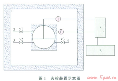圖1為實(shí)驗(yàn)裝置示意圖,實(shí)驗(yàn)裝置主要部分包括可視化高壓反應(yīng)釜、恒溫空氣浴、真空系統(tǒng)、溫度傳感器、壓力傳感器、數(shù)據(jù)采集系統(tǒng)??梢暬邏悍磻?yīng)釜為反應(yīng)系統(tǒng)的核心部分,釜體材料為不銹鋼,兩端帶有玻璃視窗,可觀察水合物的靜態(tài)生成情況;恒溫空氣浴由制冷機(jī)提供冷量,可控溫度范圍為-20~40℃,穩(wěn)定運(yùn)行時(shí)控溫精度為±0.1℃;真空系統(tǒng)采用2XZ-0.5型旋片真空泵(浙江黃巖黎明實(shí)業(yè)有限公司)來實(shí)現(xiàn),可以將反應(yīng)釜抽真空至0.06Pa;溫度傳感器為Ptl00四線制鉑電阻溫度傳感器(北京賽億凌科技有限公司生產(chǎn)),精度為±0.1℃,置于反應(yīng)釜內(nèi)兩相分界面處,用來測量水合反應(yīng)過程中的溫度;壓力傳感器(上海天沐自動(dòng)化儀表有限公司生產(chǎn))量程為0~1MPa,測量壓力精度為0.05%;數(shù)據(jù)采集系統(tǒng)通過安捷倫數(shù)據(jù)采集儀Agilent 34970A來實(shí)現(xiàn)。