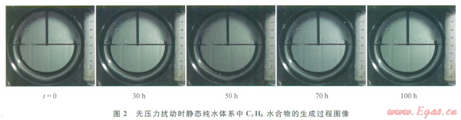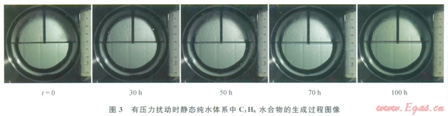 圖2、3分別分別為無壓力擾動(dòng)和有壓力擾動(dòng)2種不同的條件下,靜態(tài)純水體系中C3H8水合物的生成過程圖像。在元壓力擾動(dòng)條件下,實(shí)驗(yàn)開始時(shí)向反應(yīng)釜中充入C3H8氣體,使反應(yīng)釜內(nèi)壓力達(dá)劍0.51MPa,在水合物生成過程中不再補(bǔ)充壓力;而在有壓力擾動(dòng)時(shí),充入C3H8氣體使體系壓力達(dá)到初始值,待體系壓力降低至穩(wěn)定后立即補(bǔ)充C3H8氣體,使反應(yīng)過程中體系壓力始終維持在0.51MPa。