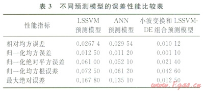 天然氣日負荷預(yù)測的常用模型有LSSVM預(yù)測模型、ANN預(yù)測模型,將筆者所建立的小波變換和LSSVM-DE組合預(yù)測模型與上述兩種常用的預(yù)測模型進行對比,采用的定量評價方法為國際上普遍采用的5種誤差評價方法,分別為相對均方誤差、歸一化均方誤差、歸一化絕對平方誤差、歸一化均方根誤差、最大絕對誤差,具體公式叮參照本文參考文獻[15]。定量評價結(jié)果見表3,定性評價結(jié)果見圖7。