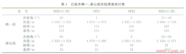 MX5、MX2井為直井,梁山組厚度分別為10m、16m。MX005-H1為大斜度水平井,梁山組井斜60°,斜厚l9m,折算垂厚10m。設(shè)計的MX005-H2井棲一段、梁山組垂厚分別為100m、10m。設(shè)計以55°~61°井斜角鉆開石炭系,斜厚分別折算為187m、21m(表1)。