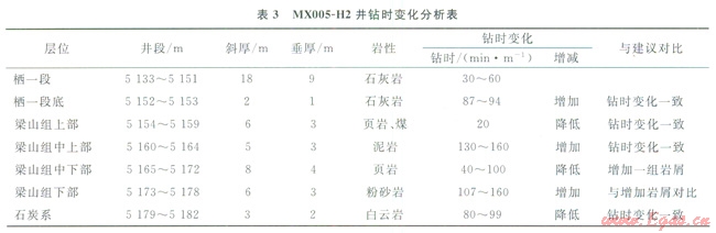 采用了鄰井實鉆巖性組合為依據(jù),把鉆時錄井作為判斷鉆頭進(jìn)入梁山組,巖屑錄井及循環(huán)觀察作為判斷鉆遇巖性的手段。如某石炭系氣藏的待鉆井MX005-H2井的3口鄰井,MX5、MX005-H1井位于構(gòu)造高點,MX2井位于潛伏高點。待鉆井與MX005-H1井距離281m。所以,工程應(yīng)用地層、巖性數(shù)據(jù)主要參考MX005-Hl、MX5井實鉆數(shù)據(jù)。