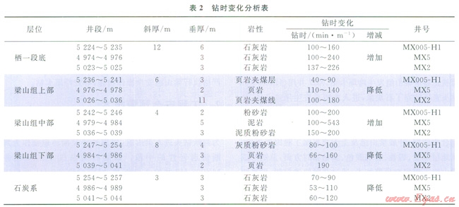 1)在棲一段中鉆進(jìn),一旦鉆時增加,就可能鉆到了棲一段底部,再鉆2~5 m,鉆時又降低,巖性由石灰?guī)r變?yōu)轫搸r,部分井夾煤層(煤線),顏色變深、變黑,表明可能進(jìn)入了梁山組。