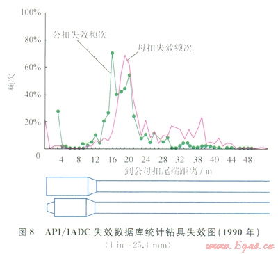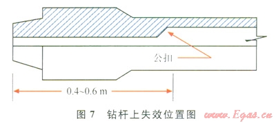 至于這種失效為什么往往發(fā)生在母扣接頭以下0.4~0.6m處,且剛好處于鉆具的加厚帶區(qū)域。追溯鉆桿生產(chǎn)工藝[10]便知:管體材質、接頭和焊縫均已不是現(xiàn)代鉆桿生產(chǎn)的瓶頸,加厚帶及其附近位置已變?yōu)殂@具最主要的應力集中點,因而也是最易發(fā)生疲勞損壞的位置,API及IADC數(shù)據(jù)庫[11]顯示大多數(shù)鉆具的失效都發(fā)生在接頭兩端加厚帶的位置(圖7、8)。