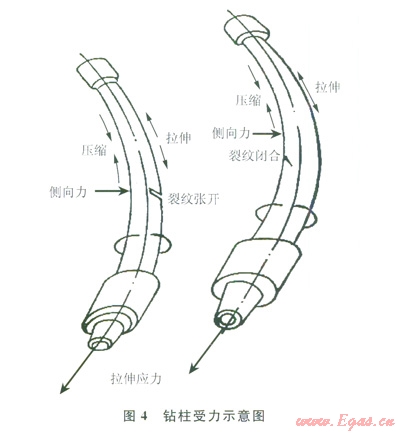 1930年,英國人古德曼(J.Goodman)簡化了疲勞極限的曲線圖[6],根據(jù)他的疲勞理論可以得出,鉆桿的疲勞強度不僅與鉆桿自身的性能有關,而且與其承受的平均應力即拉伸應力有關,拉伸應力越大,鉆桿疲勞所需的最低彎曲應力幅越小,所以井越深、鉆桿越靠近井口,鉆桿就容易發(fā)生疲勞,其受力情況見示意圖4。