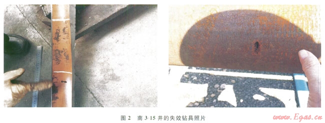 中國石油大慶鉆探工程公司(以下簡稱大慶鉆探)在冀東油田同時施工作業(yè)了4口井,分別使用同一廠家同批新鉆具,南3-15井[3]從201 3年7月1日起連續(xù)發(fā)生3起鉆具刺漏事件,刺漏位置均為母扣接頭以下0.4~0.6m的位置(圖2)。而其他3口井則沒有發(fā)生鉆具刺漏事件。其后技術交流過程中,廠商的解釋為井斜狗腿度偏大,而現(xiàn)場鉆井工程師卻列舉了一系列深井狗腿更大、使用同樣規(guī)格鉆具的其他廠家鉆具卻沒有發(fā)生失效,雙方對失效原因的認識無法達到基本一致。表3為該井的造斜段數(shù)據(jù)。