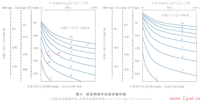 其后Hansford和Lubinski提出過一種簡易的方法來估算鉆桿通過狗腿段后的累積疲勞損傷,定制了腐蝕介質和非腐蝕介質中E級鉆桿在不同狗腿嚴重度和拉力下消耗的壽命[9](圖6,參見GB/T 24956—2010《石油天然氣工業(yè)鉆柱設計和操作限度的推薦作法》第68頁)。在不同轉速和鉆速情況下,可用下面公式進行校正。