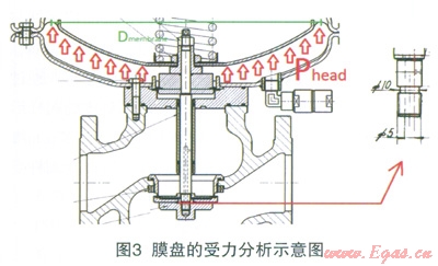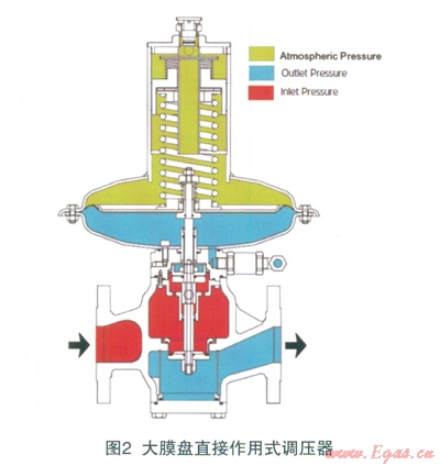 該款調(diào)壓器為某進口品牌,在我公司大量使用,其質(zhì)量和性能較為穩(wěn)定,一直沒有出現(xiàn)過問題。該款調(diào)壓器為大膜盤直接作用式調(diào)壓器,其連接口徑DN80,膜盤頭部直徑為書600,其結(jié)構(gòu)型式平衡閥芯式調(diào)壓器,閥瓣位于閥座下部,是典型的失效開啟型調(diào)壓器,在主皮膜破裂或壓力信號管無壓力反饋時,閥口處于開啟狀態(tài)。大膜盤調(diào)壓器的特點是結(jié)構(gòu)簡單、響應(yīng)迅速、關(guān)閉精度高,由于大膜盤的作用,其關(guān)閉精度很高,當(dāng)下游壓力高于設(shè)定值時,閥口關(guān)閉密封性好,無流量泄漏。其結(jié)構(gòu)見圖2。