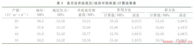 利用式(1)~(2)、(8)~(11)對普光B井的井筒壓力進(jìn)行計(jì)算,同時也利用常用的干氣井井底流壓計(jì)算公式[11]進(jìn)行計(jì)算,其計(jì)算結(jié)果如表3所示。
