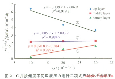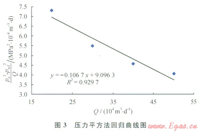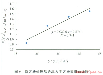 以普光B井為例來說明所建立的產(chǎn)能評價方法。首先,利用第2部分建立的井底流壓取值深度優(yōu)化方法,得出普光8井第8~11層的累積產(chǎn)能為總產(chǎn)能的1/2,即取第8層深度處的壓力為井底壓力;其次,利用第3部分的井筒壓力分布計(jì)算模型,計(jì)算出第8層的井底流壓;第三,對該井資料進(jìn)行處理,并進(jìn)行壓力平方法回歸,其結(jié)果見圖6。