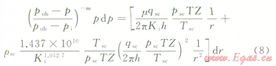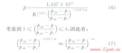 式中qsc為標(biāo)準(zhǔn)狀況下氣井產(chǎn)量,104m3/d;h為氣層射開有效厚度,m;`m為平均地層壓力及溫度下氣體的黏度,mPa·s;`Z為平均地層壓力及溫度下氣體的偏差系數(shù);rsc為標(biāo)準(zhǔn)狀況下氣體密度,g/cm3;T為地層溫度,℃;Tsc為標(biāo)準(zhǔn)狀況下溫度,℃;psc為標(biāo)準(zhǔn)狀況下壓力,MPa;pob為儲層上覆壓力,MPa;pi為儲層原始地層壓力,MPa;pe為儲層目前地層壓力,MPa;p為泄油半徑處地層壓力,MPa;pwf為井底流壓,MPa;r為徑向半徑,m;re為泄油半徑,m;rw為井筒半徑,m。