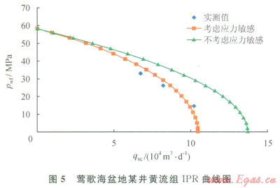 根據(jù)氣藏實際資料,計算得上覆地層壓力為61.0MPa,油藏壓力為58.2MPa,結(jié)合筆者推導(dǎo)的公式對產(chǎn)能進行分析,其結(jié)果如圖5所示。從圖5中可看出,該氣藏應(yīng)力敏感效應(yīng)嚴(yán)重,應(yīng)力敏感效應(yīng)引起的氣井無阻流量損失在23%左右。從產(chǎn)能測試數(shù)據(jù)分析,考慮應(yīng)力敏感效應(yīng)的產(chǎn)能方程更符合實際產(chǎn)能測試。因此對鶯歌海盆地異常高壓氣藏在產(chǎn)能評價時應(yīng)考慮應(yīng)力敏感效應(yīng),綜合分析確定該氣藏單井合理工作制度,盡量減少應(yīng)力敏感效應(yīng)對單井產(chǎn)量造成的損失。