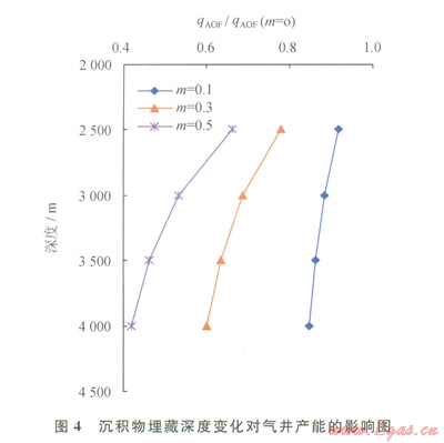根據(jù)上覆壓力的經(jīng)驗公式:pob=0.01[h水深+2.3(h中深-h水深)],計算出不同儲層埋深下的上覆壓力,再結(jié)合式(12)探討上覆壓力對產(chǎn)能的影響(圖4)。從圖4中可以看出:隨著沉積物埋藏深度增加,上覆壓力增大,應(yīng)力敏感效應(yīng)越嚴(yán)重,氣井產(chǎn)能損失越大。