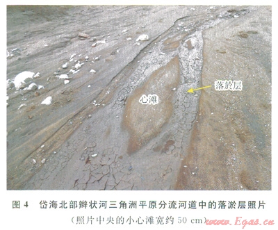 辮狀分流河道較直,以礫石質(zhì)沉積為主,向下游方向逐漸變細(xì),砂質(zhì)增多,到達(dá)湖岸線附近時(shí)以細(xì)礫和中、粗砂為主,寬2~15m,深幾十厘米到1m左右。其內(nèi)可進(jìn)一步劃分為心灘和水道兩個(gè)亞微相。