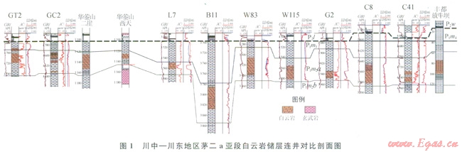對(duì)川東、川中地區(qū)鉆揭中二疊統(tǒng)鉆井的鉆錄井資料重新梳理,系統(tǒng)研究巖心、巖屑、電測(cè)資料,并對(duì)中二疊統(tǒng)野外露頭剖面(華鎣山二崖剖面、西天剖面、李子埡剖面,豐都暨龍鎮(zhèn)烏羊壩剖面、放牛壩剖面,豐都武平大壩剖面)進(jìn)行仔細(xì)觀測(cè),筆者發(fā)現(xiàn)[2],川東—中局部地區(qū)中二疊統(tǒng)茅口組茅二a亞段內(nèi)發(fā)育一套最厚為30m的白云巖、硅質(zhì)白云巖儲(chǔ)層(圖1)。