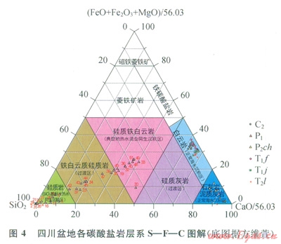 方維萱[7]提出S—F—C圖解。C端元(CaO)代表正常海水的沉積作用形成的碳酸鹽巖,S端元(SiO2)代表以SiO2為酸酐的熱水同生沉積作用形成的硅質(zhì)巖,F端元(FeO+Fe2O3+MgO)代表富Fe、Mg碳酸鹽型熱水同生沉積作用形成的菱鐵礦巖。川東地區(qū)所有中二疊統(tǒng)層狀硅質(zhì)巖、硅質(zhì)白云巖、白云巖樣品均落在硅質(zhì)鐵白云巖(典型的熱水混合同生沉積區(qū))、硅質(zhì)巖(SiO2酸酐型熱水同生沉積區(qū))及鐵白云質(zhì)硅質(zhì)巖(過渡區(qū))內(nèi),而四川盆地石炭系、長(zhǎng)興組、飛仙關(guān)組、嘉陵江組和雷口坡組的樣品則落在正常海水沉積區(qū)(圖4)。S—F—C圖解顯示中二疊統(tǒng)層狀硅質(zhì)巖、白云巖、硅質(zhì)白云巖成因與其他層系的白云巖成因截然不同,為熱水成因。