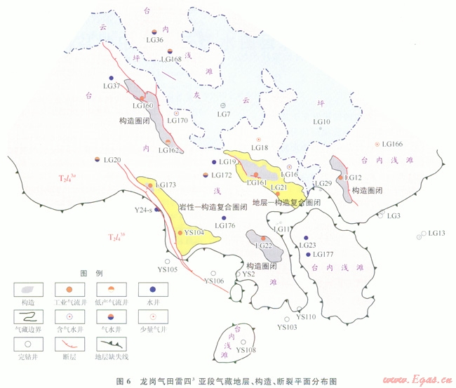 摘 要:龍崗氣田雷四3亞段氣藏是四川盆地中三疊統(tǒng)雷口坡組新發(fā)現(xiàn)的與印支期剝蝕和巖溶作用有關(guān)的氣藏,弄清該氣藏的特征及控制因素,將極大地拓展四川盆地雷口坡組的勘探領(lǐng)域。為此,基于區(qū)域地層對(duì)比、小層劃分、沉積相、儲(chǔ)層特征及氣藏特征等綜合研究成果,分析得出以下結(jié)論性認(rèn)識(shí):①雷四3亞段的儲(chǔ)層發(fā)育于其頂部a小段,風(fēng)化剝蝕作用控制了a小段儲(chǔ)層的分布及溶蝕孔洞的發(fā)育;②a小段儲(chǔ)層巖性以泥、粉晶角礫云巖為主,次為泥粉晶針孔云巖,物性為低 特低孔隙度、特低滲透率,孔隙類型主要為基質(zhì)孔隙、裂縫和溶蝕洞穴,臺(tái)內(nèi)灘沉積微相控制了儲(chǔ)層的發(fā)育;③在大型地層尖滅的背景下,受構(gòu)造、斷層和巖性變化的影響,發(fā)育地層一構(gòu)造、巖性一構(gòu)造等多種圈閉類型;④氣藏?zé)N源以上三疊統(tǒng)須家河組為主,生儲(chǔ)蓋組合以側(cè)生側(cè)儲(chǔ)和上生下儲(chǔ)為主,次為下生上儲(chǔ),其氣水關(guān)系復(fù)雜,存在多個(gè)水動(dòng)力系統(tǒng);⑤雷四3亞段a小段尖滅帶附近的次級(jí)巖溶斜坡是尋找工業(yè)氣井的最有利區(qū)。