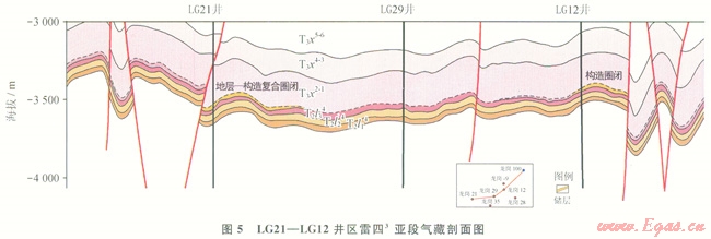 四川盆地雷口坡組大多數(shù)氣藏圈閉類型為構(gòu)造圈閉,根據(jù)雷四3亞段a小段地層、沉積微相、儲(chǔ)層對(duì)比分析、巖心物性分析和測井綜合解釋成果、綜合鉆井測試、氣水分布特征、地震儲(chǔ)層預(yù)測成果和構(gòu)造分析,認(rèn)為雷四3亞段氣藏圈閉類型較為復(fù)雜,在大型地層尖滅的背景上,受構(gòu)造、斷層和巖性變化影響,發(fā)育地層 構(gòu)造、巖性 構(gòu)造、構(gòu)造等多種圈閉類型(圖5、6)。
