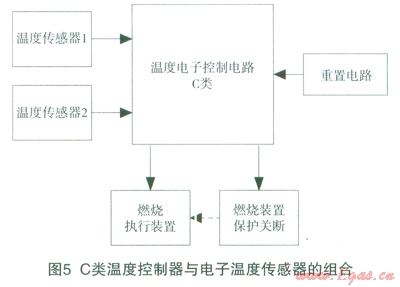 如圖5,這種設(shè)計沒有一個最后的獨(dú)立保護(hù)裝置,安全依賴于系統(tǒng)安全完整性(參考文獻(xiàn)[2])的要求保證。其中一個溫度傳感器設(shè)在燃燒器(或熱交換器),另一個在輸出熱水端。當(dāng)其中一路溫度傳感器或其檢測電路失效,另一路可以被監(jiān)測并保護(hù)。由于采用全電子控制器來實現(xiàn)溫度控制功能,該電子控制器必須按照C類電子控制器的要求來設(shè)計,軟件也必須符合C類軟件要求,這樣使整體符合C類安全要求。
