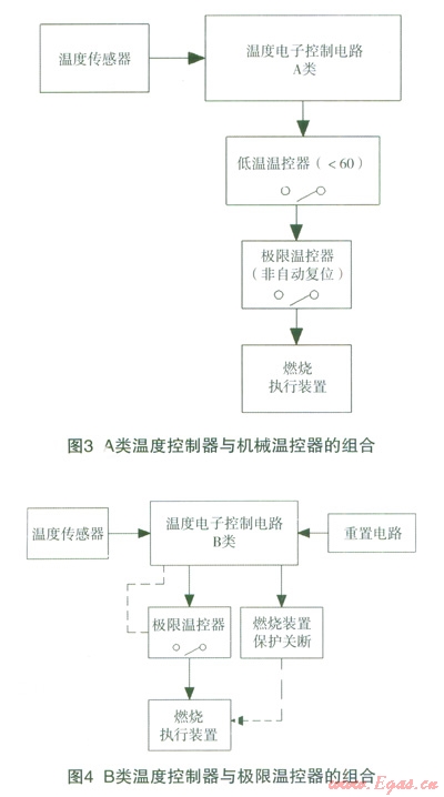 如圖3,這是一個傳統(tǒng)的解決方法,使崩了機(jī)械控溫的組合,即由溫度控制(溫度調(diào)節(jié)器)和防止溫度過熱風(fēng)險(溫度限定器)構(gòu)成,具體要求可參見器具標(biāo)準(zhǔn)(例女HEN297、EN483)的內(nèi)容要求。機(jī)械溫控結(jié)構(gòu)是由多年實踐而產(chǎn)生的并依賴冗余技術(shù)作為原理,被認(rèn)為是安全的,不需要控制器另外采取特別的措施。此處A類溫度控制電子電路與低溫溫控器可以相當(dāng)于一個機(jī)械的溫度凋節(jié)器。