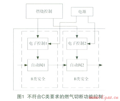 第一,兩個閥門的控制均符合B類安全要求,但組合是不能達(dá)到C安全要求的,如圖1。從閥門組合的容錯上分析,當(dāng)其中一個閥門失控(如有雜物或卡死),另一個閥能保持正常即可符合安全要求。例如,自動閥2失控,自動閥1必須保證安全。B類安全的要求是電子控制1在第一個故障的條件下保證安全狀態(tài),但該故障可能不被檢測到,當(dāng)?shù)诙€故障仍出現(xiàn)在電子控制1時,電子控制1可能導(dǎo)致自動閥1不受控,這樣兩個閥都不受控,所以不符合C類安全要求。