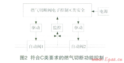 第二,兩個閥門同時由符合C類安全的電子控制器控制,整體可以達(dá)到C安全要求,如圖2。當(dāng)自動閥1失效,如果電子控制器符合C類安全,自動閥2在任意兩個故障的條件下均可以保證處于安全狀態(tài),所以整體符合C類安全要求。按照這種分析,自動閥1、2是可以同時驅(qū)動的(并聯(lián))。所以閥的冗余與閥驅(qū)動的冗余是安全設(shè)計兩個方面,都必須要做到。