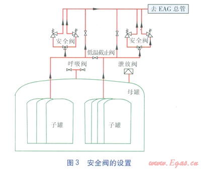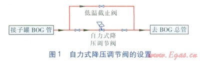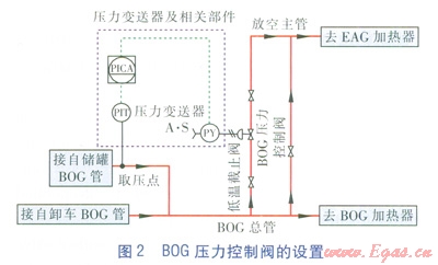 BOG壓力控制閥為氣動式薄膜凋節(jié)閥,設(shè)置于自力式降壓調(diào)節(jié)閥后、BOG總管的支管路上,進(jìn)口與BOG總管連接,出口與放空主管連接,取壓點設(shè)置在BOG壓力控制閥前儲罐BOG管上,當(dāng)取壓點壓力達(dá)到設(shè)定值時,閥門開啟,實現(xiàn)少量放散。BOG壓力控制閥的設(shè)置見圖2(圖2中EAG指安全放散氣體)。