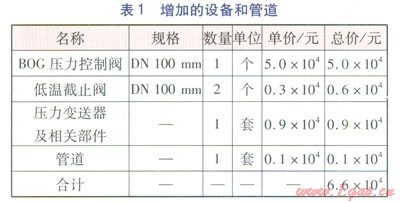 設(shè)置BOG壓力控制閥,需要增加一套BOG壓力控制系統(tǒng),即需要增加相應(yīng)的設(shè)備和管道,因此相應(yīng)的造價也要增加。增加的設(shè)備和管道見表1。