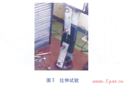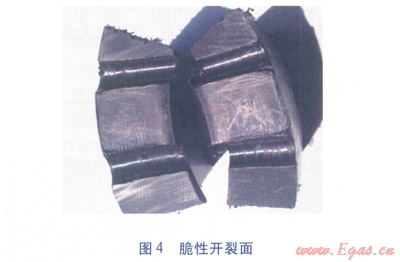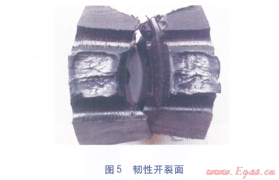 表2中,耐壓(靜液壓)強(qiáng)度試驗(yàn)合格,即焊接處無(wú)破壞,無(wú)滲漏;拉伸性能試驗(yàn)不合格,指焊接接頭破壞類型為脆性開(kāi)裂(見(jiàn)圖4);拉伸性能試驗(yàn)合格,則焊接接頭破壞類型為韌性開(kāi)裂(見(jiàn)圖5)。