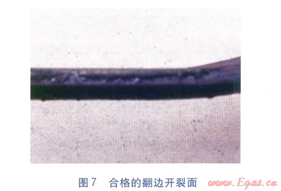 合格的判定:翻邊不開(kāi)裂,或者即使開(kāi)裂,開(kāi)裂面是韌性開(kāi)裂面(見(jiàn)圖7),判定為合格;翻邊發(fā)生開(kāi)裂,并且開(kāi)裂面是光滑平整的脆性開(kāi)裂面(見(jiàn)圖8),判定為不合格。對(duì)于判定不合格的接頭需割除接頭重新焊接,如果不合格的數(shù)量較多,但翻邊脆性開(kāi)裂長(zhǎng)度小于25%,則應(yīng)該通過(guò)選取典型試件做拉伸性能試驗(yàn)來(lái)最終確定該類焊接接頭是否合格。