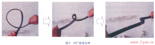 工程實(shí)踐中,我們通過(guò)與材料制造及熱熔連接設(shè)備廠家技術(shù)人員進(jìn)行交流,發(fā)現(xiàn)采用360°的面彎并拉伸的方法(見(jiàn)圖6),可以將有質(zhì)量問(wèn)題的翻邊檢驗(yàn)出來(lái)。這種方法在最后拉伸時(shí)會(huì)在熔合面上形成很大的剪切力,比180°背彎更有效。