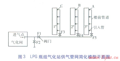 為便于論述,將LPG瓶組氣化站供氣管網(wǎng)進行簡化,簡化模型見圖3,假設(shè)供氣小區(qū)有3棟樓(1#、2#、3#),每棟樓有4個單元。以簡化模型為例,對置換的原則、順序進行探討。