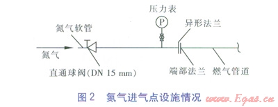 為了穩(wěn)定管道內(nèi)壓力,我們在管道入口處安裝了一只壓力表,實時觀察氮氣入口處的管道壓力(氮氣進氣點設(shè)施情況見圖2)。并為放散點與氮氣進氣點的監(jiān)控人員配備了對講機,實時保持通話。由放散點監(jiān)控人員指揮氮氣進氣點監(jiān)控人員,實時調(diào)節(jié)進氣壓力,保證適宜的置換壓力。庭院管道置換時,管道壓力基本控制在30~40kPa;戶內(nèi)管道置換時,管道壓力控制在2.8kPa左右。