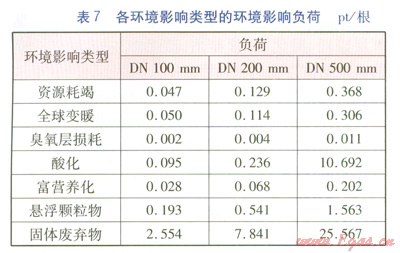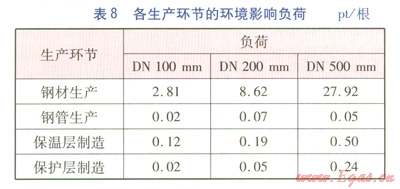 由表7可知,固體廢棄物對(duì)環(huán)境影響的貢獻(xiàn)最大,其次分別是懸浮顆粒物、酸化、全球變暖、資源耗節(jié)中鋼材生產(chǎn)的環(huán)境影響最大,其次是保溫層,最后是保護(hù)層和鋼管生產(chǎn)。主要原因是鋼材生命周期過(guò)程中礦石的開(kāi)采和鋼鐵冶煉都會(huì)產(chǎn)生大量的固體廢棄物,這就造成固體廢棄物對(duì)環(huán)境影響比較大。在計(jì)算生產(chǎn)環(huán)節(jié)環(huán)境影響時(shí),鋼材生產(chǎn)產(chǎn)生大量廢棄物,同時(shí)在此環(huán)節(jié)中,資源耗竭所占比重也比較大,因此鋼材生產(chǎn)就成為保溫管道生產(chǎn)階段環(huán)境影響最大的環(huán)節(jié)。公稱管徑100~500mm鋼材生產(chǎn)形成的環(huán)境影響負(fù)荷分別為2.81、8.62、27.92 pt/根。