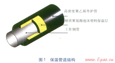 評(píng)價(jià)對(duì)象是以硬質(zhì)聚氨酯泡沫塑料作為保溫層,高密度聚乙烯作為外護(hù)管的保溫管道,具體結(jié)構(gòu)見(jiàn)圖1。選取規(guī)格為DN 100、200、500mm保溫管道進(jìn)行評(píng)價(jià),工作鋼管長(zhǎng)度均為12m。保溫管道各種技術(shù)參數(shù)執(zhí)行CJ/T 114—2000《高密度聚乙烯外護(hù)管聚氨酯泡沫塑料預(yù)制直埋保溫管》,3種規(guī)格保溫管道的具體技術(shù)參數(shù)見(jiàn)表1。
