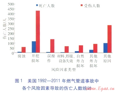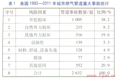 通過分析城市燃氣管道事故統(tǒng)計數(shù)據(jù),將管道面臨的風險因素分為7個大類,從管道事故發(fā)生可能性和管道事故后果兩個方面進行分析。以1992—2011年美國的燃氣管道事故數(shù)據(jù)為基礎(chǔ),確定了7類風險因素的風險等級排序。城市燃氣管道系統(tǒng)風險因素的等級排序依次為開挖損壞,其他原因,其他外力損壞,自然外力損壞,誤操作,材料、焊接、設(shè)備失效,腐蝕。詳細分析了7大類風險因素在城市燃氣管道日常運行管理中的表現(xiàn)形式,對于制定安全評價方法,提高安全管理水平具有積極意義。
