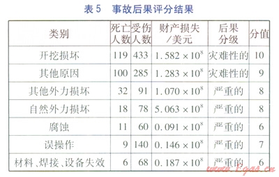 不同類型風險因素導致的事故類型也不相同,使得管道事故造成的后果差異也較大。例如,開挖損壞一般對管道破壞較大,會導致氣體大量泄漏,產(chǎn)生火災(zāi)爆炸的可能性較大;而腐蝕類型風險一般是腐蝕穿孔,泄漏孑L徑較小,產(chǎn)生的后果也較小。