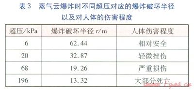 以建筑物破壞程度作為基準(zhǔn),超壓選取不同建筑物破壞程度對應(yīng)的超壓最小值(并進(jìn)行圓整),由式(1)、(2)計算壓縮機(jī)房泄漏焦?fàn)t煤氣發(fā)生蒸氣云爆炸時,不同超壓對應(yīng)的爆炸破壞半徑,并判定對人體傷害程度,見表3。