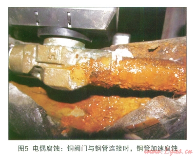 在金屬活動順序表中,Fe要比Cu活潑,在相同的環(huán)境中,Fe的電位要比Cu負。當異種金屬相接觸,處于相互連通的電解質(zhì)中時,由于不同金屬之間存在實際電位差而使電位較低的金屬腐蝕速度比原來增大,電位較高的金屬的腐蝕速度減小,這種現(xiàn)象稱為電偶腐蝕[4],見圖5所示。當鋼與銅相互接觸時,鋼的腐蝕速率比其單獨存在時加大。在閥門位置,利用銅包鋼或者銅網(wǎng)進行接地時,由于電偶腐蝕的作用,會加速閥門的腐蝕。同時由于銅的良好導(dǎo)電性和自腐蝕較低的特性,利用銅材質(zhì)進行接地時,接觸電阻要比閥門直接接地更低,在這種情況下,陰極保護電流集中流入流出的現(xiàn)象會更加嚴重。