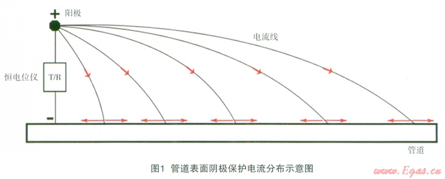 陰極保護系統(tǒng)電路路徑的構(gòu)成包括:土壤、管道、導(dǎo)線[2]。對于直流電路來說,根據(jù)歐姆定律可以知道,電路中的電流在流動過程中,電流會始終傾向于在電阻較小的路徑流動。當管道的防腐層面電阻率變化不大、防腐層沒有出現(xiàn)嚴重的破損點和接地的情況時,管道表面陰極保護電流的分布是相對較為均勻的,如圖1所示。