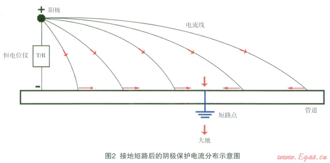 從防腐層破損點的角度上看,接地點的位置相當于一個較大的破損點。對于正常的帶有防腐層的管道,一般在陰極保護設(shè)計和運行維護過程中,認為防腐層破損點的面積只占防腐層總面積的1%-10%左右,而在出現(xiàn)接地點后,特別是由于接地極或接地網(wǎng)引起的接地短路(接地電阻在幾個歐姆或者零點幾個歐姆),在陰極保護的電流需求計算時,折合成破損點的面積時甚至可能會占到總面積的50%以上,在這種情況下可能會使接地點附近幾公里的管線得不到有效保護。