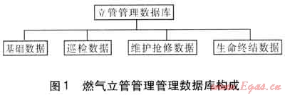 燃氣立管管理是以燃氣引入管數(shù)據(jù)為基礎的。我們在城市民用燃氣立管的管理項目實施前以及實施過程中收集了大量的基礎數(shù)據(jù),以此建立基礎數(shù)據(jù)庫;依據(jù)在運行過程中因管道日常巡查、維修、更換、事故搶修等而產(chǎn)生的運行數(shù)據(jù),建立運行數(shù)據(jù)庫。通過開發(fā)專業(yè)的立管管理軟件將上述兩個數(shù)據(jù)庫資源進行整合,形成一個完整的燃氣立管管理數(shù)據(jù)庫。工作人員運用該專業(yè)管理軟件對基礎數(shù)據(jù)、日常巡查數(shù)據(jù)以及維護、更換、事故搶修事故數(shù)據(jù)進行處理、分析,得出分析結果,依據(jù)分析結果采取相應的響應措施,并將數(shù)據(jù)進行更新,不斷補充、完善整體數(shù)據(jù)庫[2]。立管管理數(shù)據(jù)庫系統(tǒng)構成見圖1。
