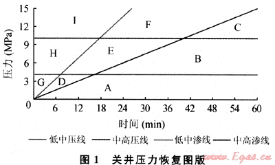 “評價點”的壓力值代表井底欠平衡程度,亦代表最大關井井口壓力,因此需要用幾條壓力值線來區(qū)分壓力級別[8]。從起始恢復點到該評價點的連線的斜率表示關井壓力恢復的快慢,取決于地層氣體侵入井筒能力的大小,代表著地層系數的大小。因此需要用始于起始恢復點的幾條不同斜率的直線來區(qū)分地層系數級別。這樣,關井壓力恢復圖版應包括幾條壓力級別水平線和幾條地層系數級別斜線。圖1中關井壓力恢復圖版中的低中壓界限和中高壓界限為兩條水平線(壓力值分別為4MPa和10MPa),用以界定關井壓力恢復評價點的幅值,低中地層系數界限和中高地層系數界限為兩條斜線(斜率分別為25°、50°),用以界定關井壓力恢復的斜率,即關井壓力恢復的快慢。