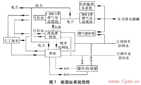 能源站設(shè)1路10kV高壓進(jìn)線,燃?xì)獍l(fā)電機(jī)組經(jīng)2臺(tái)容量為2000kVA變壓器升壓后分別接入10kV配電母線與市電并網(wǎng)運(yùn)行,每臺(tái)變壓器各接入1臺(tái)1360kW及1臺(tái)360kW燃?xì)獍l(fā)電機(jī)組。燃?xì)獍l(fā)電機(jī)組采用并網(wǎng)不上網(wǎng)的方式(或獨(dú)立運(yùn)行方式),在10kV進(jìn)線側(cè)設(shè)有逆功率保護(hù)裝置,防止向城市電網(wǎng)送電。燃?xì)獍l(fā)電機(jī)組發(fā)電在生態(tài)園范圍內(nèi)使用,除能源站設(shè)備用電外,用于生態(tài)園的為外供電量,不足部分由城市電網(wǎng)補(bǔ)充。為充分利用城市電網(wǎng)低谷時(shí)段電,并考慮夜間冷熱負(fù)荷較低,通常夜間燃?xì)獍l(fā)電機(jī)組不工作,熱泵利用城市電網(wǎng)低谷電進(jìn)行蓄冷、蓄熱,蓄冷熱裝置采用共用方式。能源站系統(tǒng)流程見(jiàn)圖1。