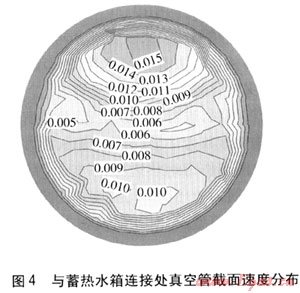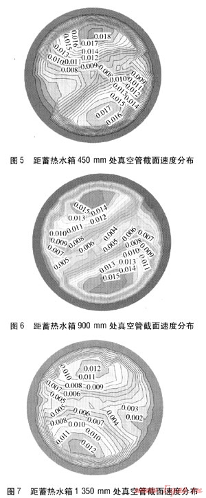 真空管(長度為1800mm)與蓄熱水箱連接處以及距蓄熱水箱450、900、1350mm處的真空管截面速度分布分別見圖4~7,圖中數(shù)值單位均為m/s。由圖4~7可知,沿著遠(yuǎn)離蓄熱水箱方向,真空管內(nèi)冷熱流體的速度先增大后減小,在距蓄熱水箱450mm處速度最大。說明在距蓄熱水箱450mm這段真空管內(nèi)存在冷熱流體的回流混合,造成熱損失,降低了集熱系統(tǒng)的效率,采用引流擋板可以在一定程度上解決該問題[11]。