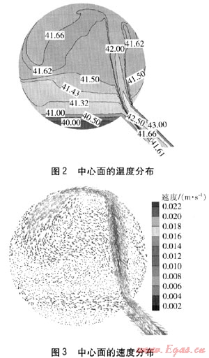 中心面的溫度、速度分布分別見圖2、3,圖2中數(shù)值單位為℃。