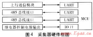 采集器的任務(wù)就是轉(zhuǎn)發(fā)集中器和燃?xì)獗碇g的通信數(shù)據(jù),并在抄讀燃?xì)獗淼臅r(shí)候短暫地給燃?xì)獗淼碾娮硬糠止╇?。采集器和集中器之間的通信采用了電力線載波通信方式。電力線載波通信有通信不穩(wěn)定、易受干擾的缺點(diǎn),但采集器只要在軟件上做些改進(jìn)就能極大地彌補(bǔ)這一缺點(diǎn),例如能短時(shí)間地儲(chǔ)存燃?xì)獗淼臄?shù)據(jù)。這樣當(dāng)給集中器返回的燃?xì)獗頂?shù)據(jù)因信道不穩(wěn)定而丟失時(shí),集中器再次下發(fā)抄這塊表的數(shù)據(jù)時(shí),采集器就不用再去抄燃?xì)獗砹?,而是很快地直接返回采集器?chǔ)存的數(shù)據(jù),這樣就使抄表成功率大大提高。采集器也要求采用可更換的通信模塊,儲(chǔ)存容量不需要太大,采集器MCU要有至少3個(gè)UART,還要有給燃?xì)獗砉╇妴卧?。采集器的硬件框圖見(jiàn)圖4。MCU的1個(gè)UART和上行通信模塊相連,2個(gè)UART設(shè)計(jì)成RS485總線。這2個(gè)RS485接口,1個(gè)是和燃?xì)獗硗ㄐ庞茫?個(gè)保留和集中器通信。如果采集器和集中器距離很近,就用保留的RS485接口直接和集中器相連。同時(shí)MCU控制1個(gè)繼電器給直讀式燃?xì)獗淼碾娮硬糠止╇姟?/span>